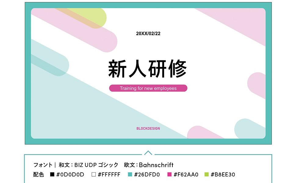 パワーポイントデザイン例 シンプルにつくりやすい図形で構成したデザイン。