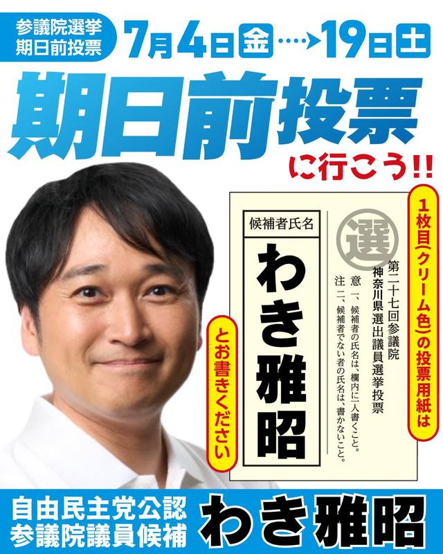 投票の案内 が届かなくても、,期日前投票 はできます。, 私や事務所には、,参議院選挙 の投票の案内が届かないから、,期日前投票に行けないという, 問い合わせが増えています。, 投票の案内が無くても、, 期日前投票所に言って、, 所定の書類に記載すれば、,期日前投票ができます。, ぜひ皆さんの貴重な一票を入れてください。, そして、 神奈川県選挙区 では、,わき雅昭候補を,。