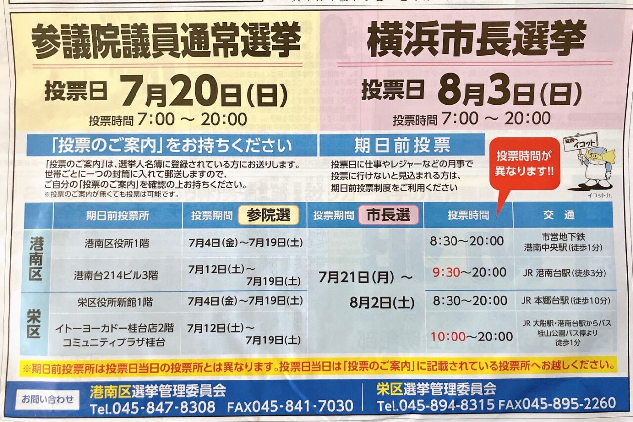 横浜市港南区・栄区 参院選の次は市長選!横浜市長選挙の期日前投票が始まりました号外NET 横浜市港南区・栄区。