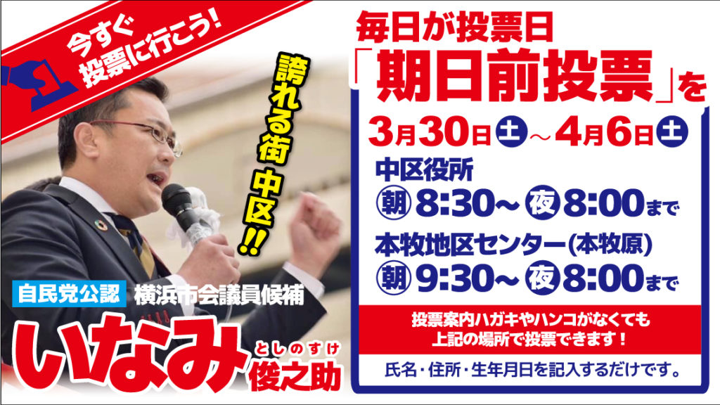 毎日が投票日!ぜひ「期日前投票」を!! – いなみ俊之助 公式サイト。
