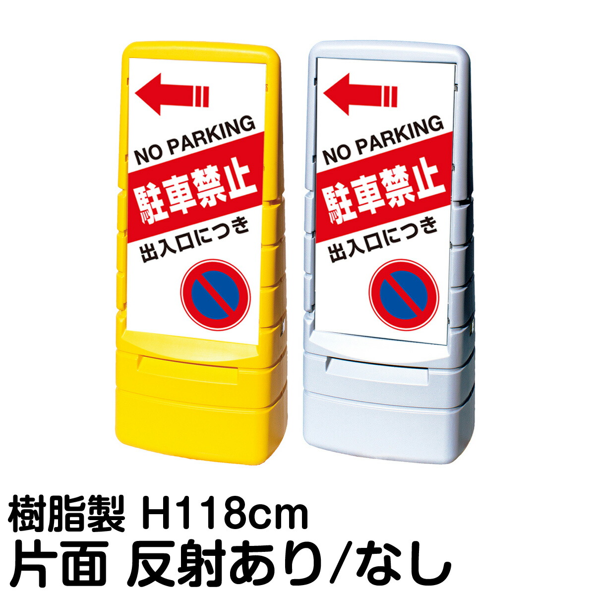 樹脂スタンド看板 サインポスト「出入口につき駐車禁止 NO PARKING」左矢印 片面のみ 反射。