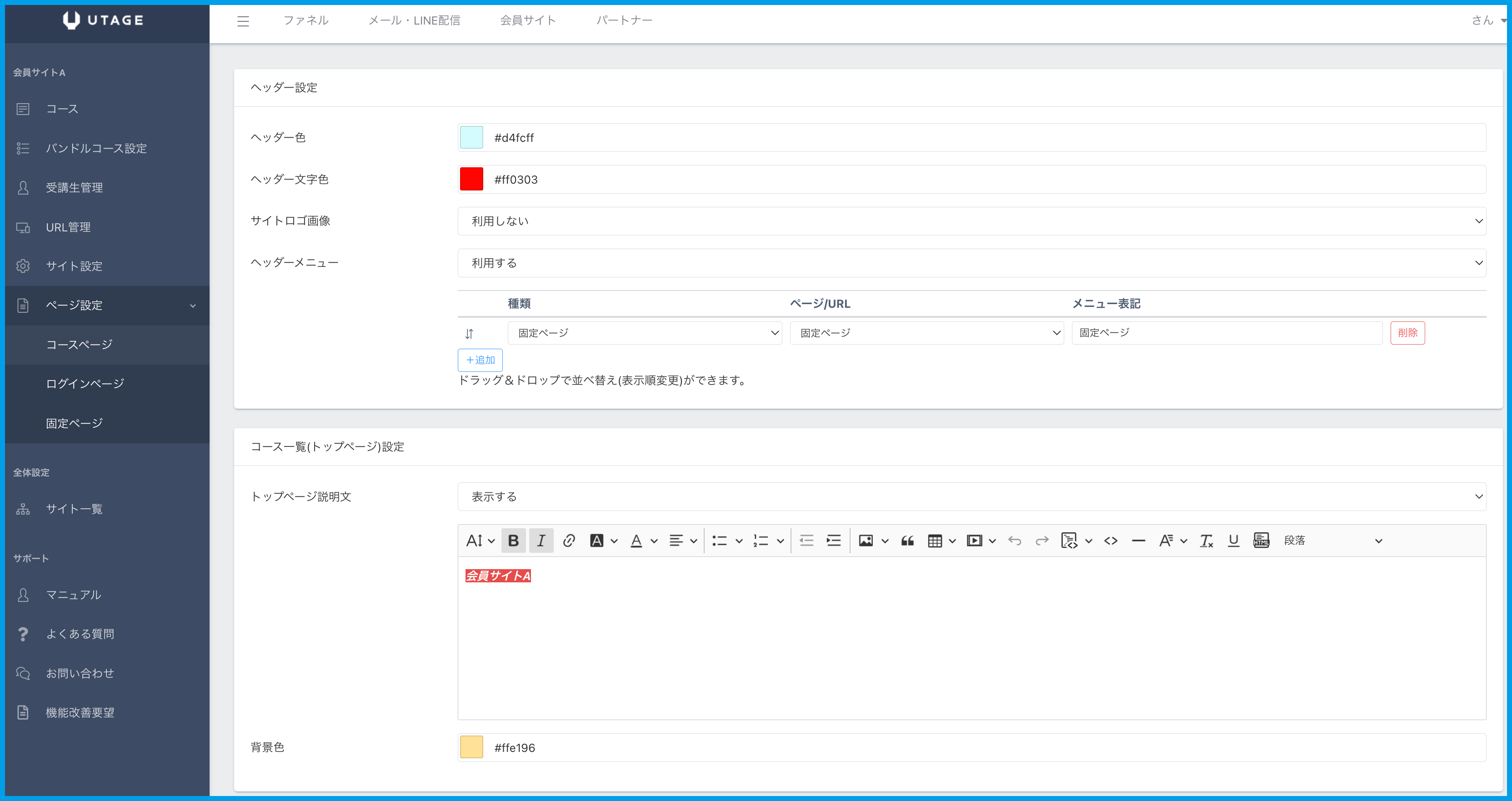 会員サイトのページ設定方法 コースページ レッスンページ ログインページ 固定ページUTAGEマニュアル。