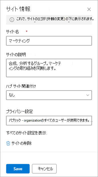サイトのタイトル、説明、ロゴ、サイト情報の設定を変更する - Microsoft サポート。