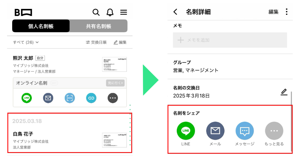 名刺を他の人に共有したいです。 – myBridge ヘルプ。