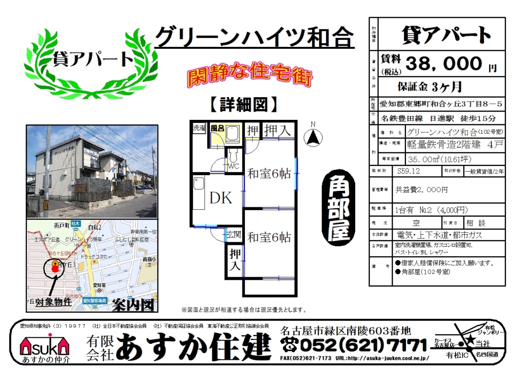 賃貸アパート物件」愛知郡東郷町和合ヶ丘賃貸アパート102号室 物件ちらし名古屋市緑区の不動産会社有 あすか住建。