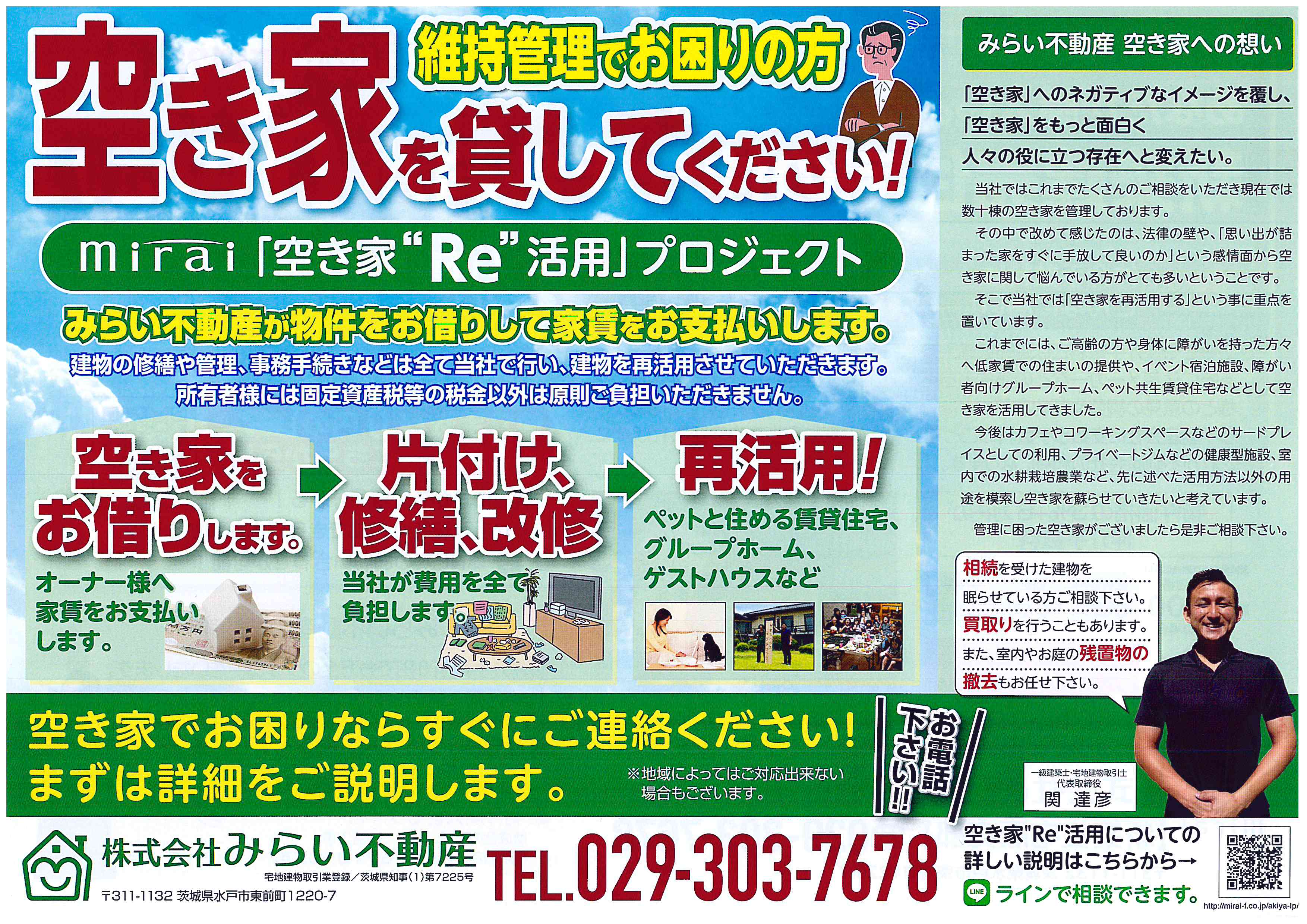空き家を貸してください!⌂ みらい不動産 さまチラシ 販促 空き家 建物再活用。