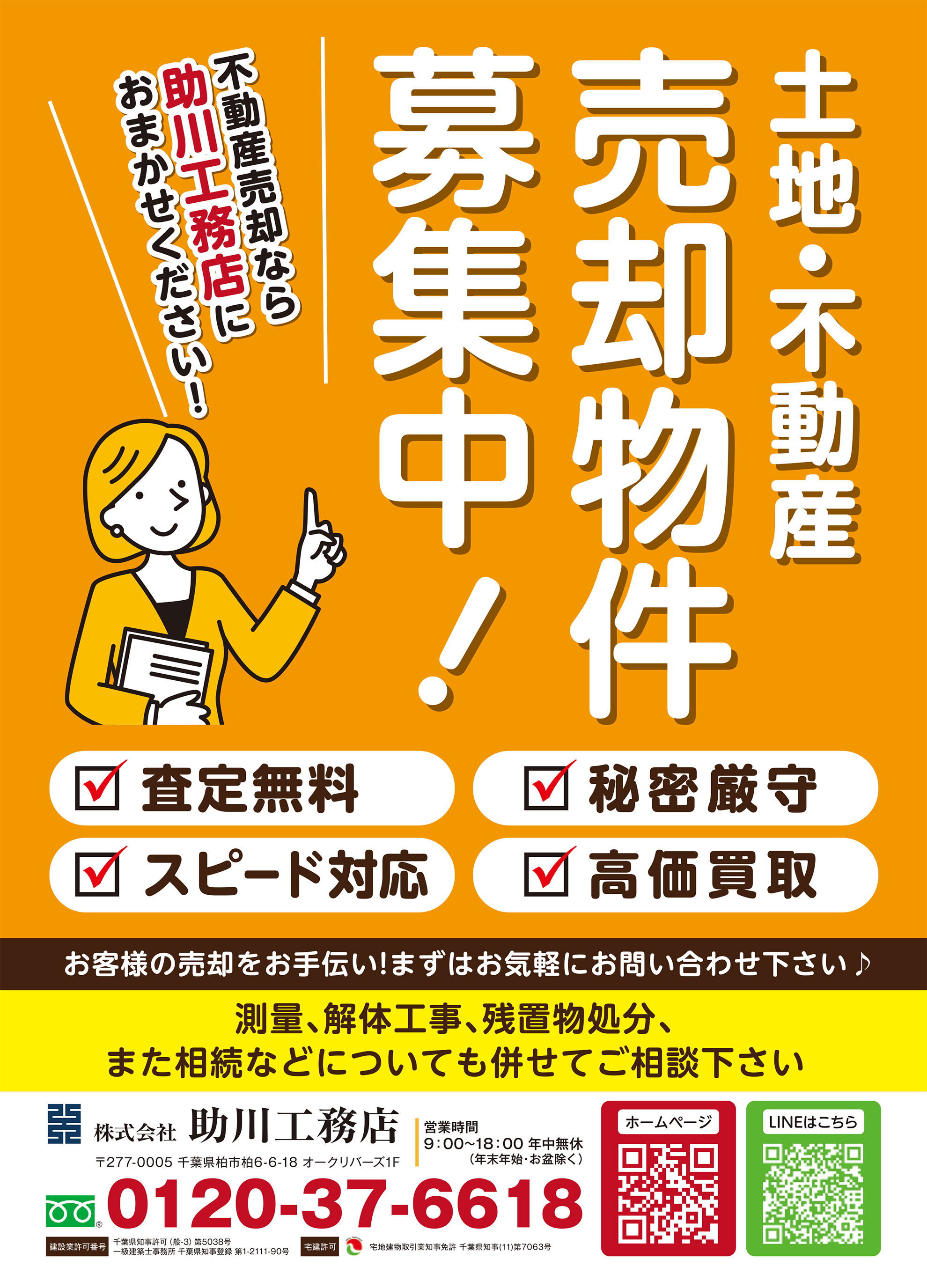 土地・不動産 売却物件募集中&お客様ご紹介キャンペーンチラシ助川工務店新築・注文住宅・家づくりを柏、我孫子でするなら。