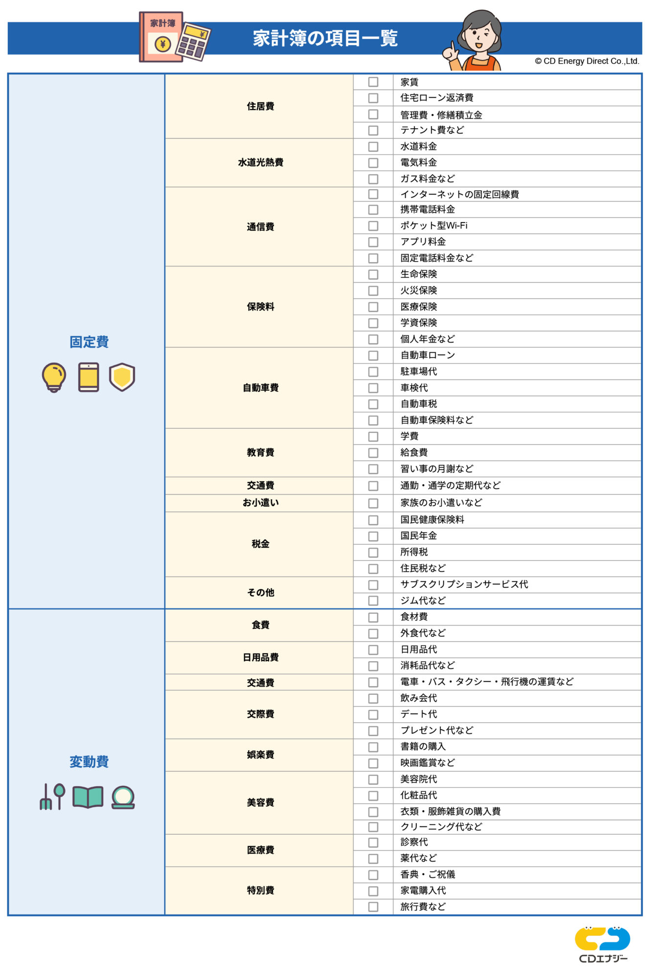 家計簿の項目を一覧化!ざっくりつける方法や挫折しないコツも紹介! - コツコツCD株式会社CDエナジーダイレクト。