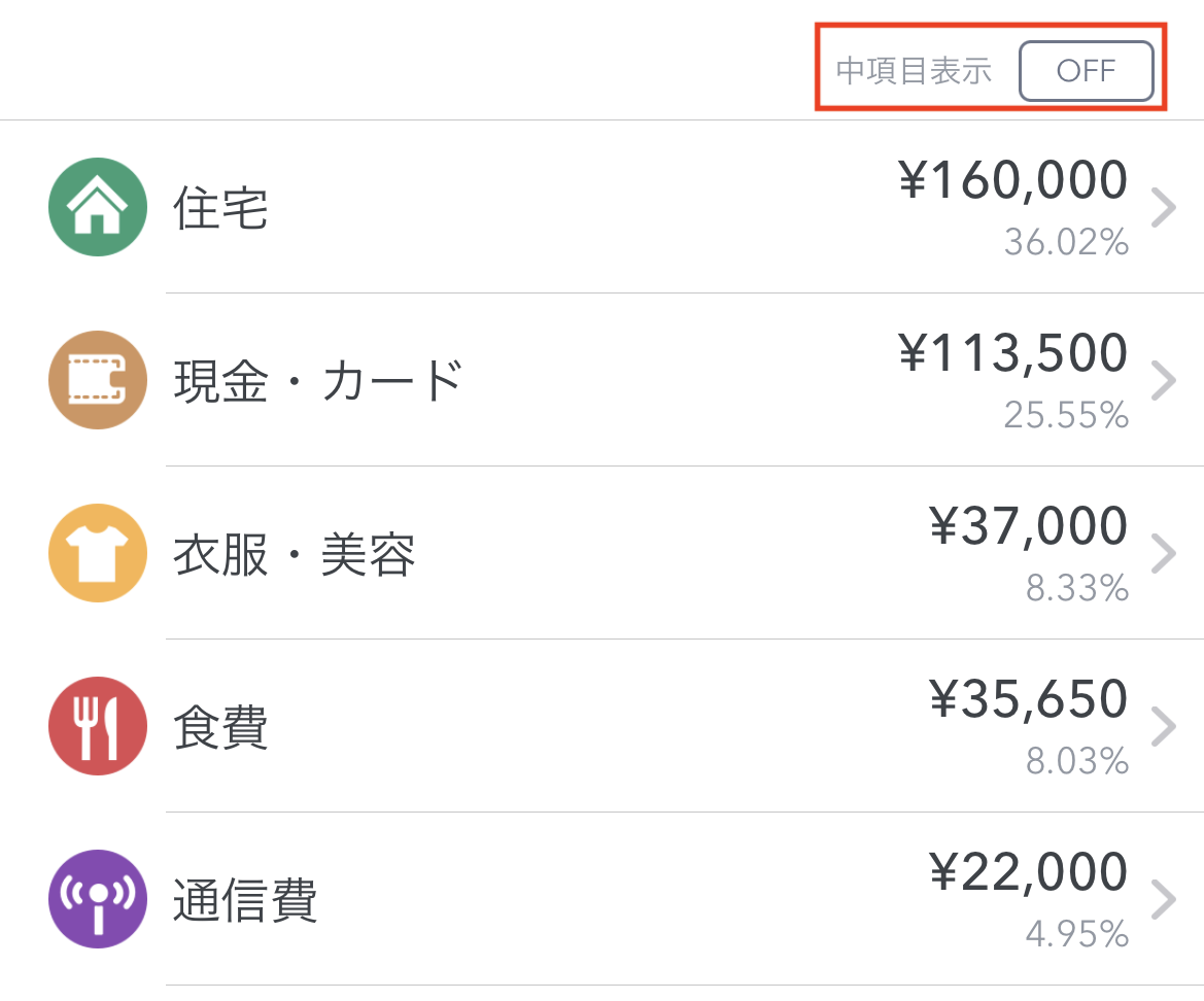 中項目の表示方法 – マネーフォワード MEサポートサイト。
