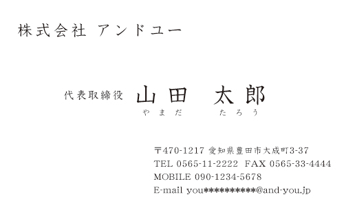氏名とローマ字の読みの間にストレートなラインを入れ、すっきりと清潔な印象を与えるデザインです。名刺作成・印刷やデザインならBUSINESS名刺印刷所。