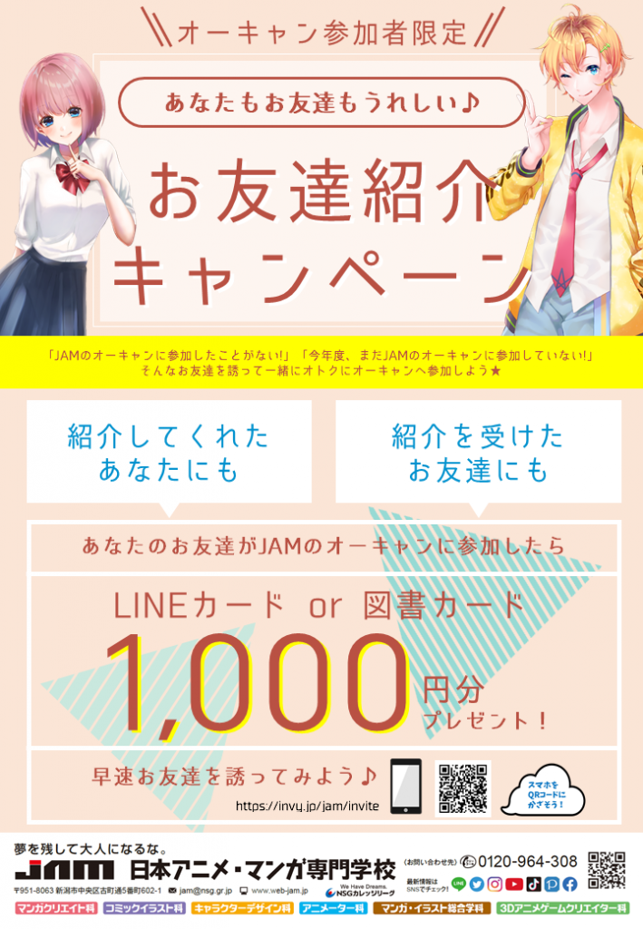 期間限定 お友達紹介キャンペーン!LINEカードor図書カード1000円分プレゼント特典あり♪ - JAM 日本アニメ・マンガ専門学校。