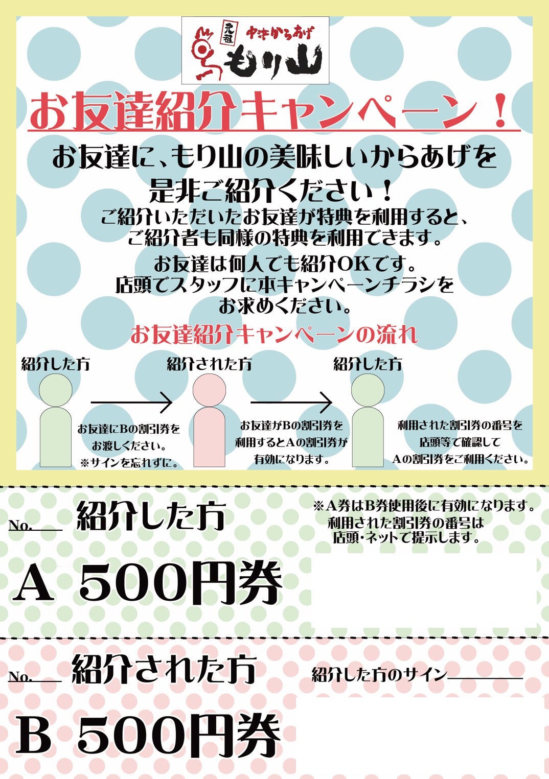 お友達紹介キャンペーン 近日開始 → 9月22日「お友達紹介キャンペーン」を開始しました元祖!中津からあげ もり山 学芸大学店。