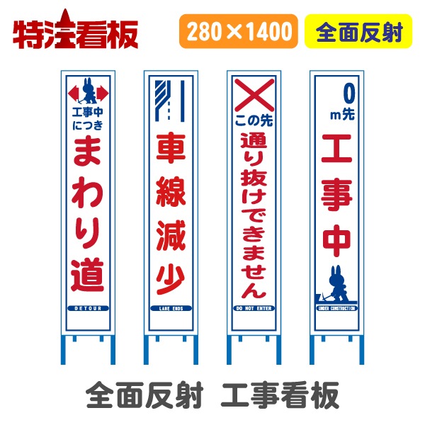 反射スリム工事看板 工事中につきまわり道 車線減少 この先通り抜けできません 0m先工事中 -特注看板.com。