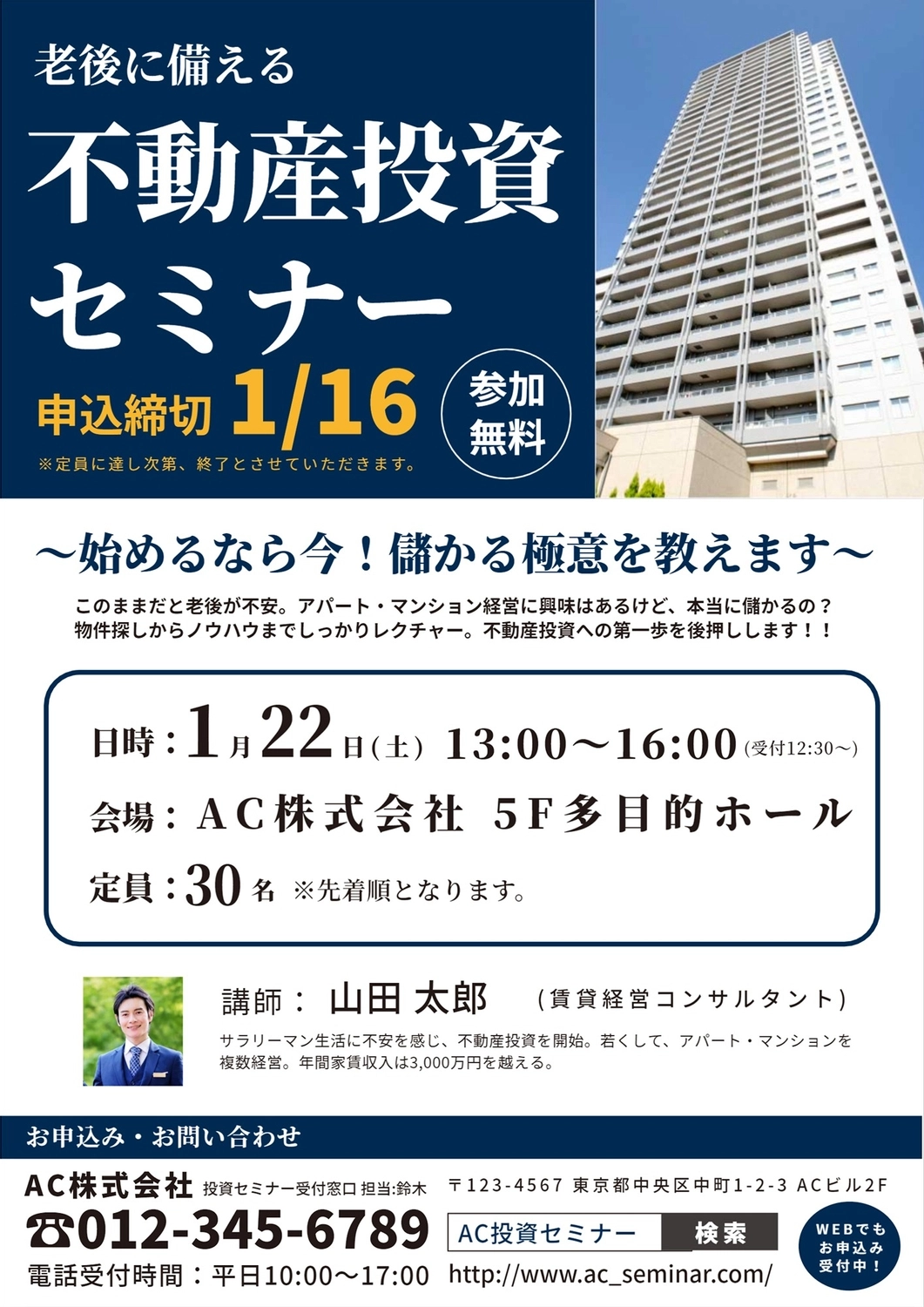 不動産投資セミナーチラシの無料チラシテンプレート 6030 - デザインAC。