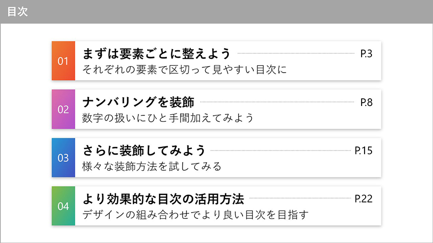 資料の概要が一目瞭然!パワポで作る効果的な目次デザインパワーポイントラボ。