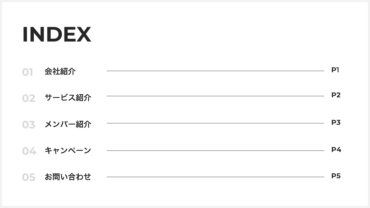 パワーポイント 目次テンプレート 無料DL可 シンプル・おしゃれデザインで使える例Bizroute。