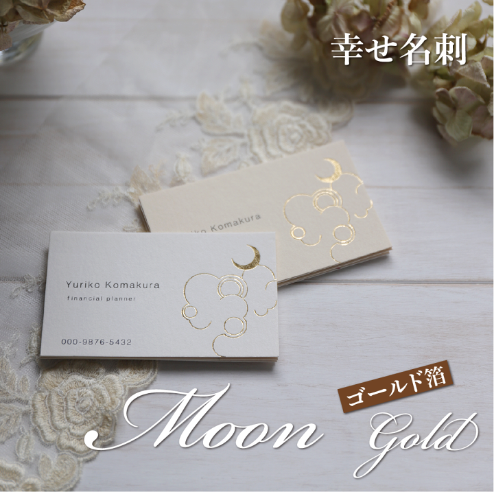 名刺 作成 幸せ名刺箔女性・優しさの象徴月の名刺 moon おしゃれなコットン紙に箔加工 50枚 セット両面印刷も選べる 制作・印刷代込送料込 化粧箱付夢工房 Print & Design。