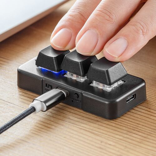 プログラマブルキーボード ミニ3キー・片手キーボード・左手デバイス・ゲーミングキーボード・マクロキーボード・マクロ機能・メカニカル・青軸・割付・バックライト付き・有線接続・ブラックSKB075激安通販のイーサプライ。