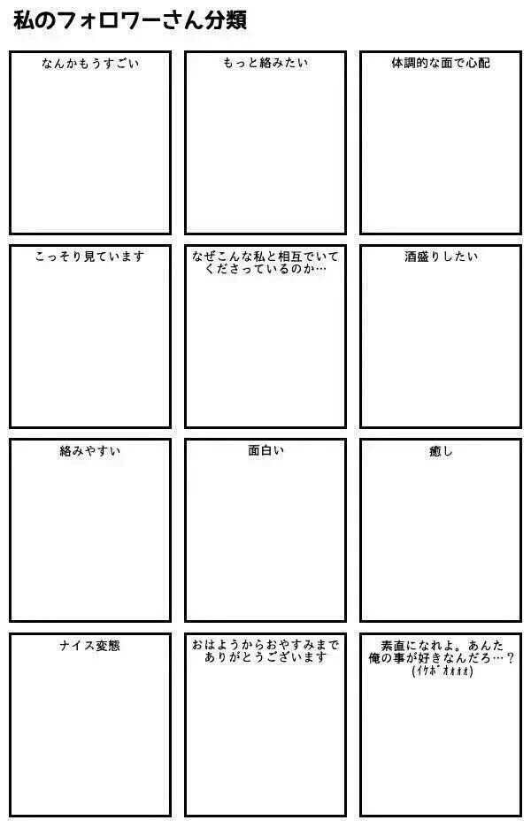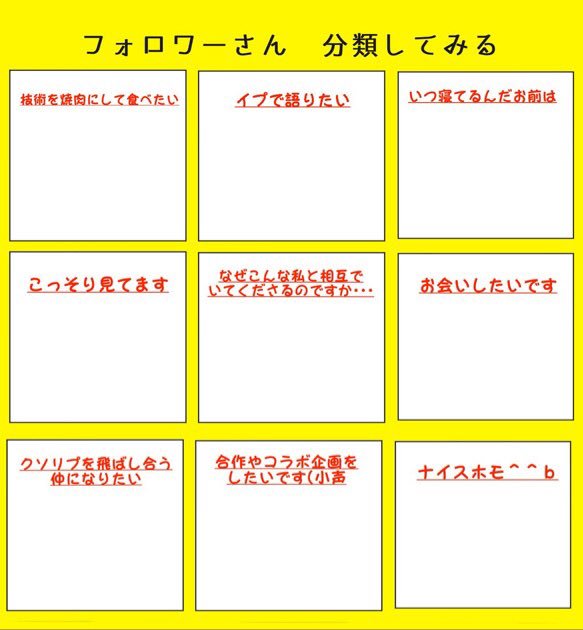 永倉掃除 on X: " おかしいフォロワー分類表 TLに狂人が多いのでテンプレート作りました。ジョークとして笑える人達と遊んでねhttps:t.co E6iHOFtaaB"X。