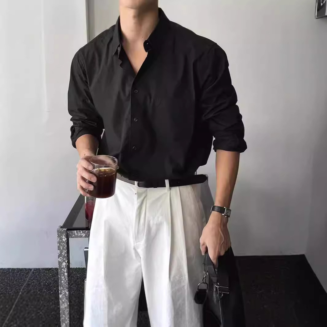 ジャケット 男性用 トップス 春秋物 ポリエステル 混紡 ゆったり カジュアル スタイル 白 黒 シャツ メンズ 長袖 無地 スリムフィット 襟付き韓国風 ファッション ビジネス カジュアル トップス ポリエステル混紡 しわになりにくい 大人カジュアル 春秋 シャツ メンズ。