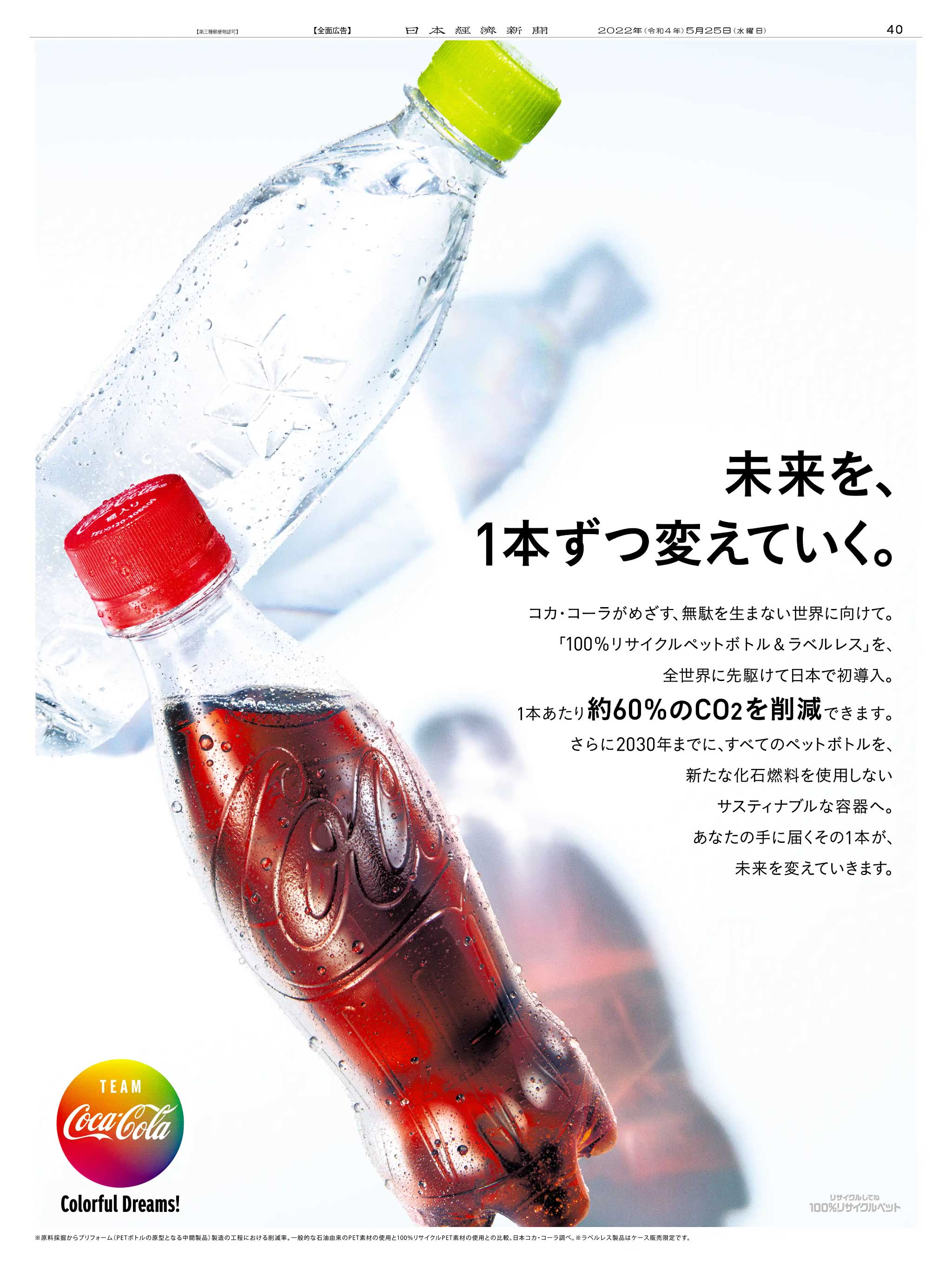 NIKKEI BRAND VOICE 日本経済新聞の広告紹介アカウント on X: "5 25掲載日本コカ・コーラ の広告です。全世界に先駆け「100%リサイクルペットボトル&ラベルレス」を導入。紙面特集では「 NIKKEI脱炭素プロジェクト」に参画する同社ホルヘ・ガルドゥニョ社長が、 脱。
