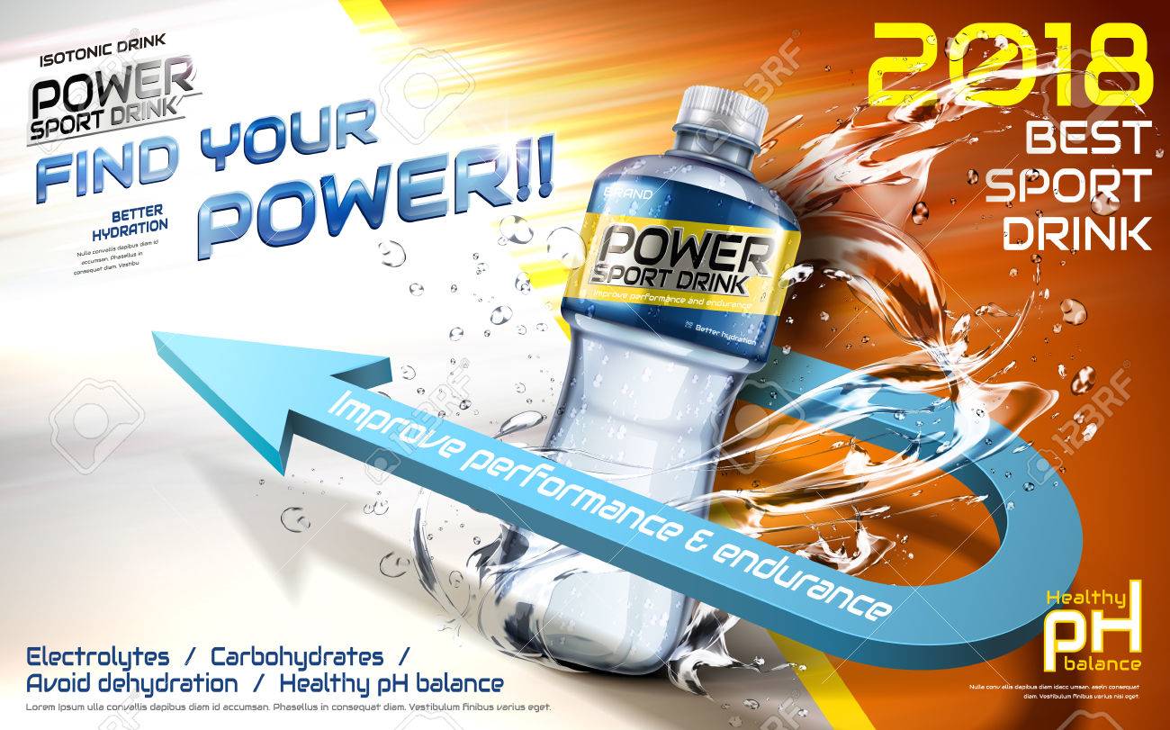 スポーツ飲料広告、ペットボトル、液体および 3 D 図と 3 D 矢印をはねてのイラスト素材・ベクター Image 86999682。