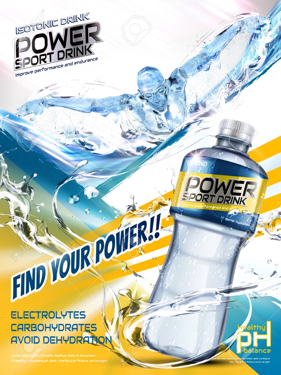 スポーツ飲料広告、飛び散っと 3 D イラストレーションでペットボトルのバタフライを泳いで元気選手のイラスト素材・ベクター Image 86963725。