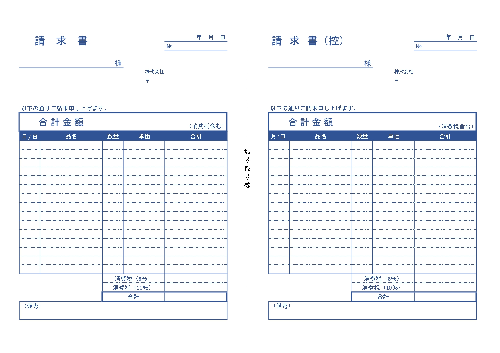 控えとセットA4・2枚組の請求書「word・Excel・PDF」編集&手書きに対応したシンプル無料テンプレート王の嗜み。