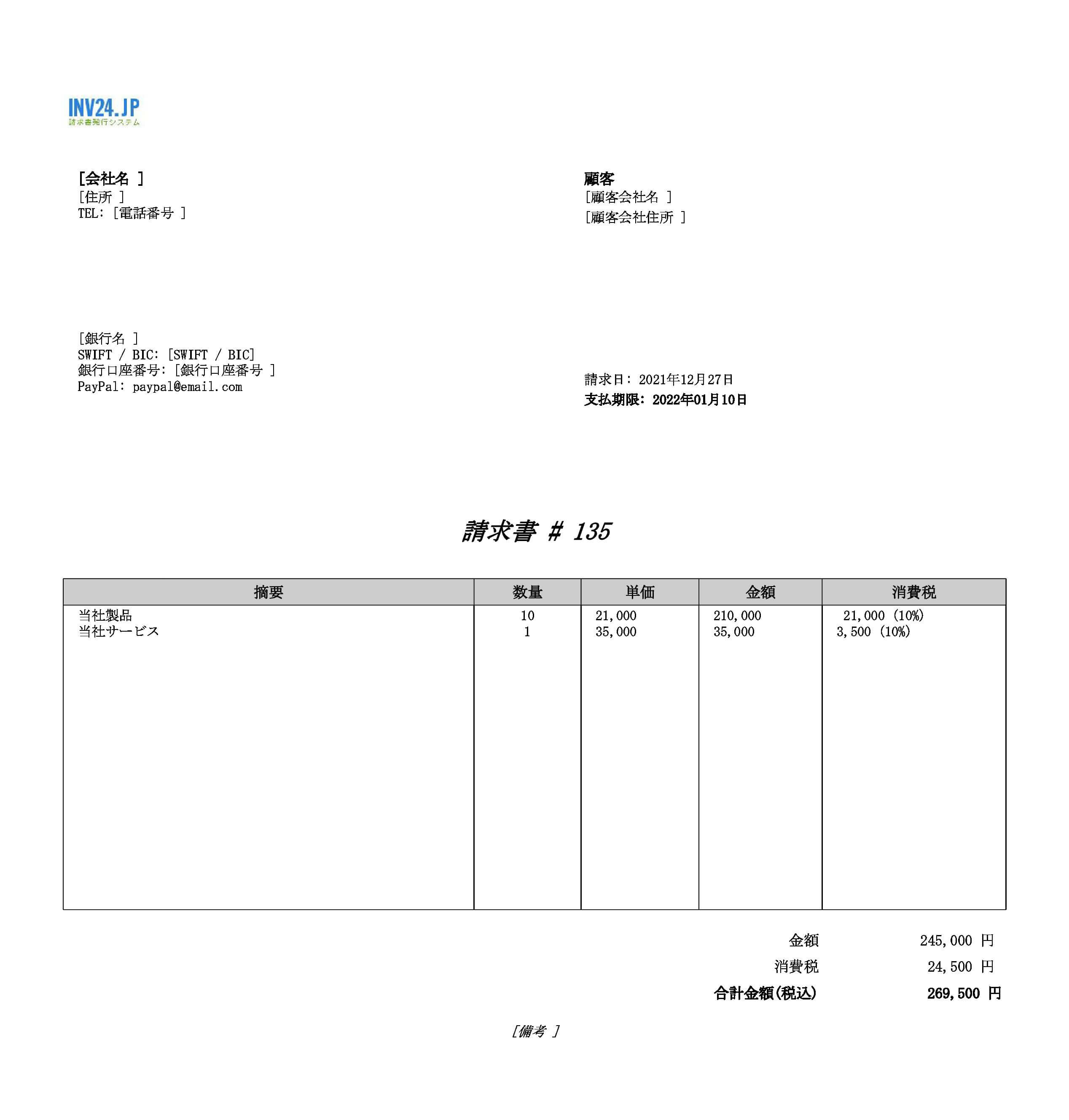 無料DL 個人向け請求書テンプレートPDF・Excel形式・インボイス対応済Bizroute。