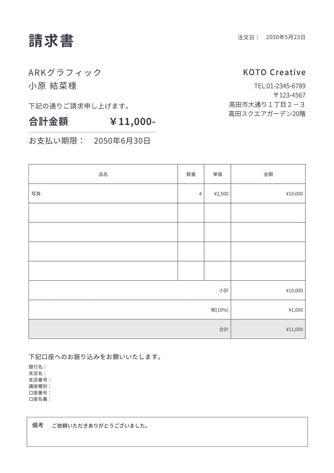 おしゃれな請求書の無料請求書テンプレート 4992 - デザインAC。