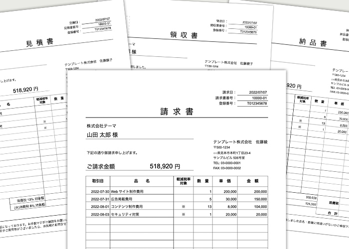 インボイス対応 シンプル 取引日あり の見積書・請求書・納品書・領収書テンプレート。
