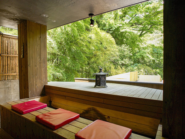 静観荘 公式 箱根湯本 温泉旅館テラスに露天風呂がある客室掛け流し露天風呂付き客室お部屋でお食事。