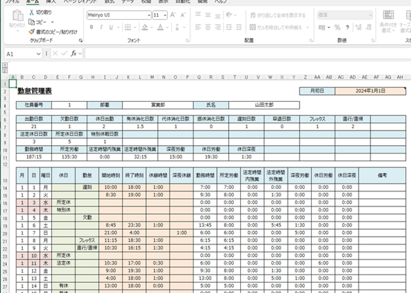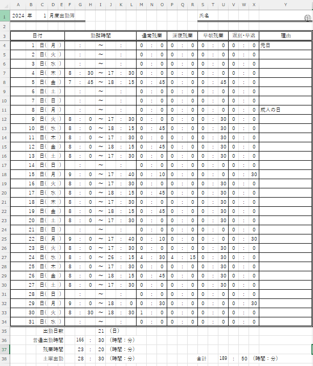 勤怠表-Excelで作成したテンプレートをダウンロード - 無料でダウンロードできるフォーマット テンプレート・雛形。