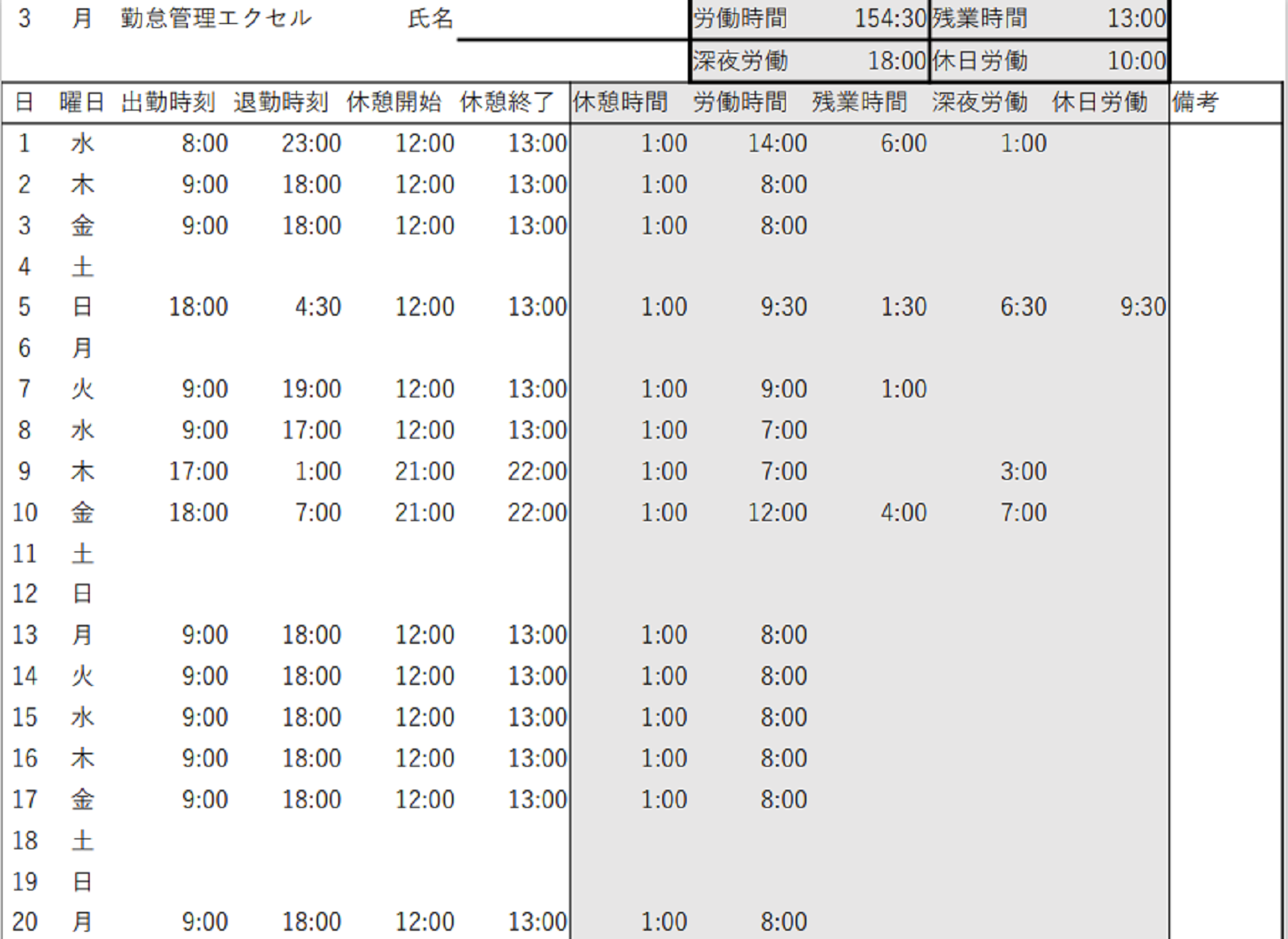 エクセルで使える勤務時間計算テンプレートをご紹介勤怠管理表を自作する方法も解説。