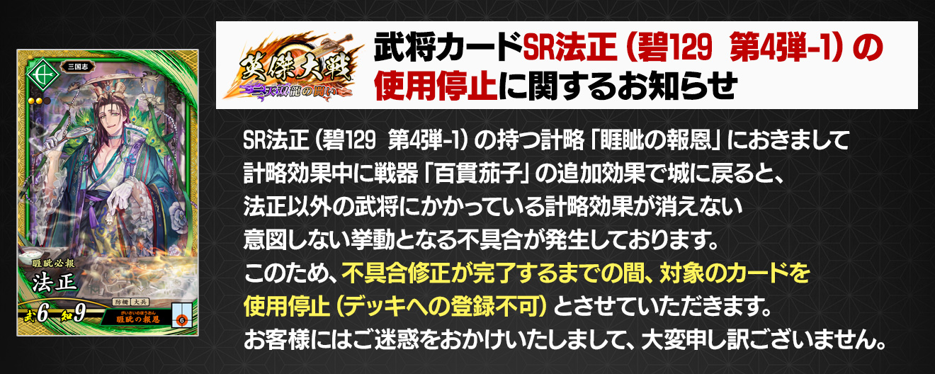 武将カードSR法正 碧129 第4弾-1 の使用停止に関するお知らせ 10 2更新 お知らせ英傑大戦 七海の彩旗 セガ公式。