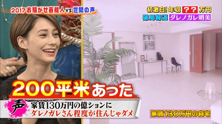ダレノガレ明美 年収6,000万円以上あるので家賃130万円のマンションに住めている。テレビみた。