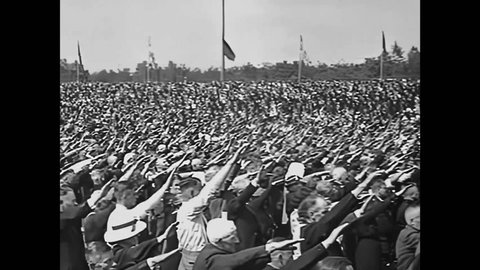 CIRCA 1933 – ベルリンのスポーツ宮殿でドイツの首相としてヒトラーの最初のスピーチの間にナチス敬礼で腕を上げる人々。」の動画素材 ロイヤリティフリー 1096213857Shutterstock。