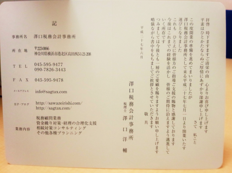 独立開業話 名刺・開業の挨拶状編新井勇樹税理士・公認会計士@前橋市。