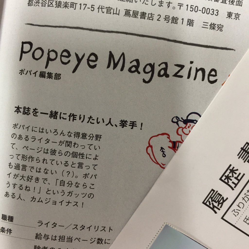 POPEYE على X: "ポパイ3月号「仕事とは?」に掲載した求人募集では、ポパイ 編集部で働いてもらえるフリーランスのライター、スタイリストも募集しています。一緒にポパイを作ってくれる、我こそは!という方、お待ちしております。詳しくは本誌にて。https:t.co。
