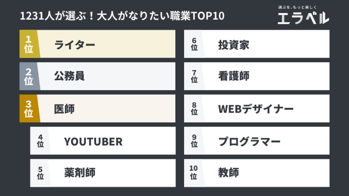 なりたい職業ランキング!3位看護師、2位医師、1位は? 高校生919人に調査高校生なうスタディサプリ進路 高校生に関するニュースを配信。