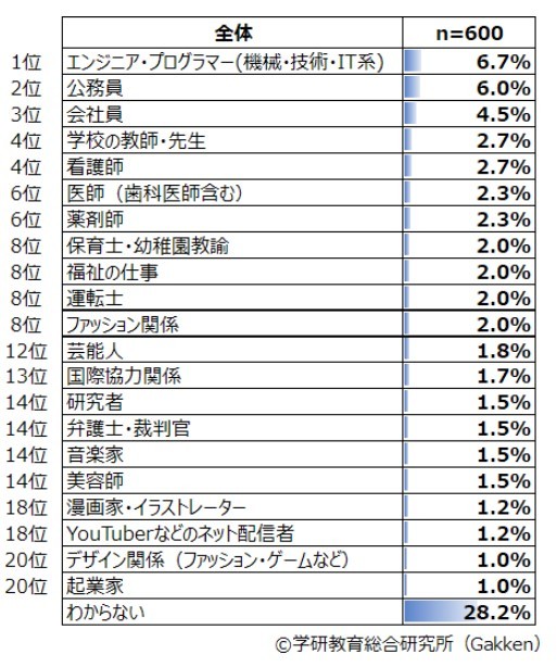 高校生のなりたい職業1位に「エンジニア・プログラマー」 学研調査 男子・高1女子に人気 - ITmedia NEWS。