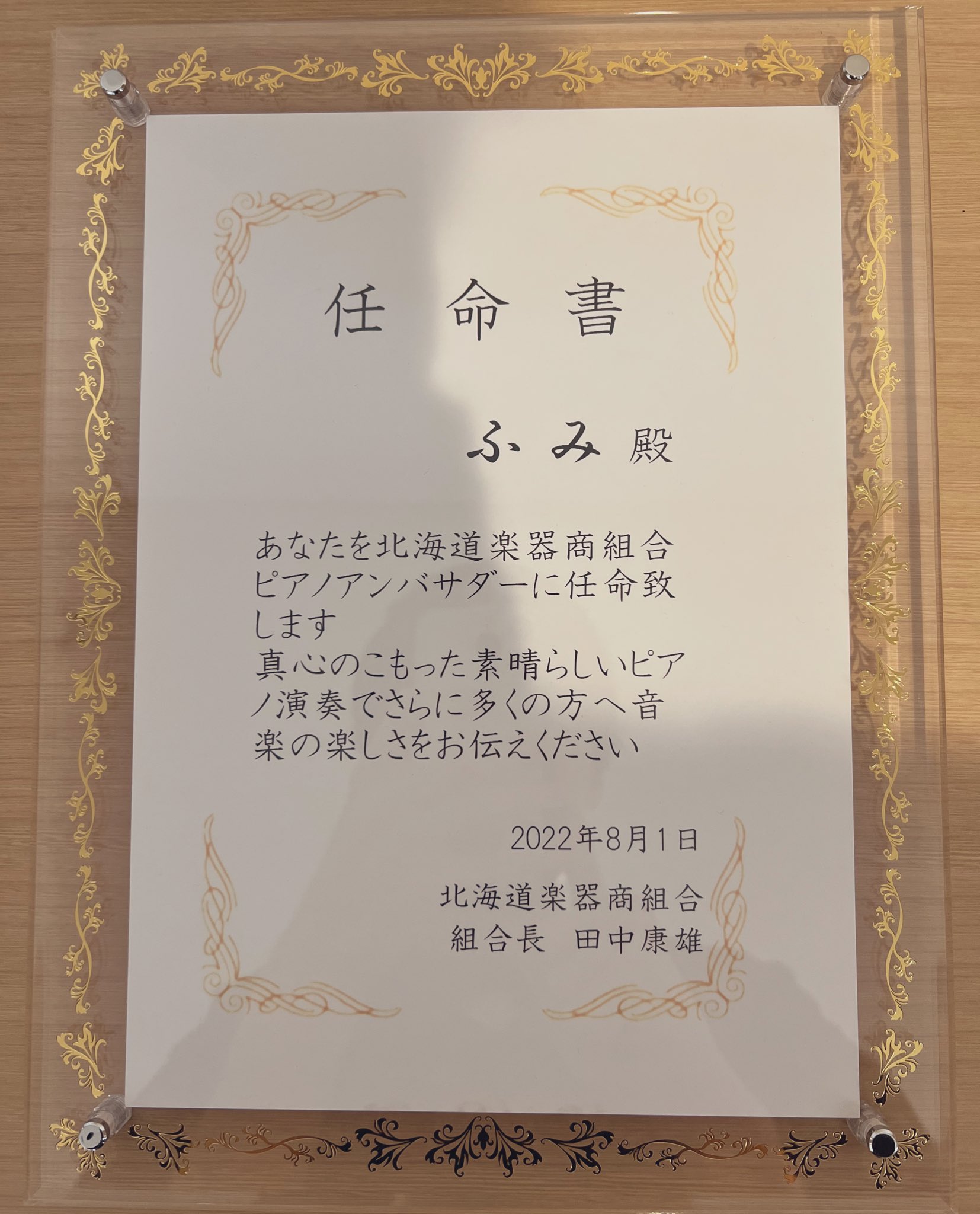 ふみ on X: "北海道楽器商組合ピアノアンバサダーの素敵な任命書をいただきました! また帯広での差し入れ、段ボール3箱分全て受け取りました!改めてイベントありがとうございました🥹 https:t.co yM54tdeWPC"X。