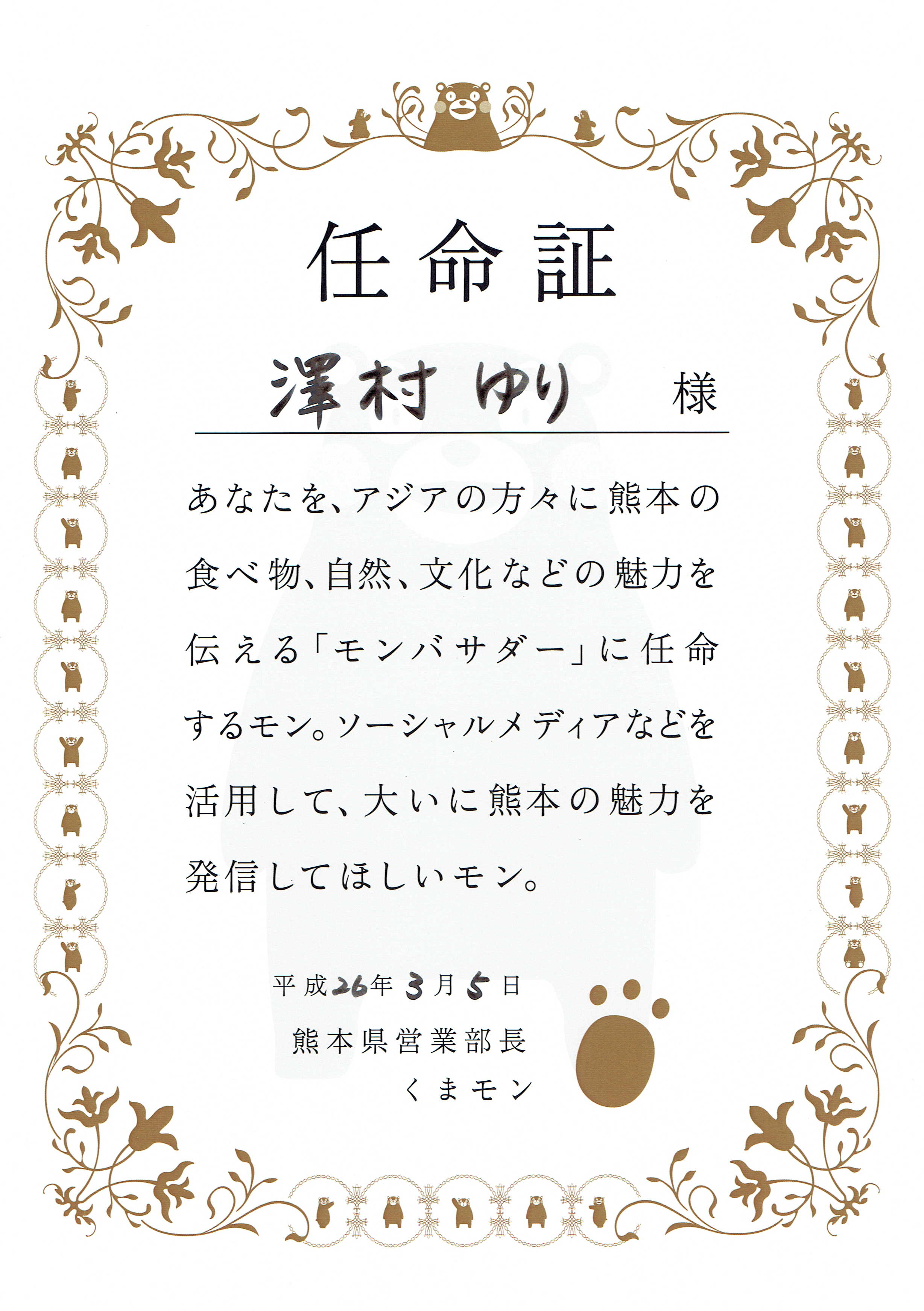 ベトナムトレーディング株式会社くまモンの任命証 - ベトナムトレーディング株式会社。