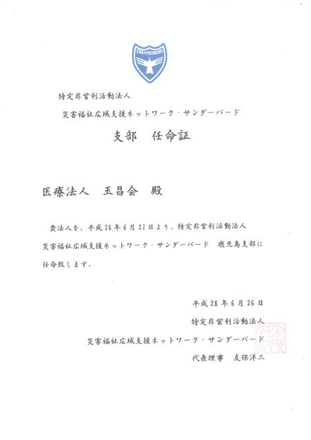 災害福祉支援ネットワーク・サンダーバード任命書玉昌会 法人サイト。