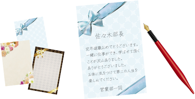 退職祝いのメッセージ例文集と、書き方のポイントやコツを相手別 上司・先輩・同僚・部下・後輩・家族 にご紹介。