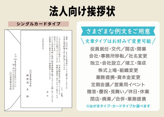 挨拶文例の杜転勤・退職・社長交代等の挨拶状をお手軽ネット印刷で。個人・法人挨拶状の文例100種類以上。