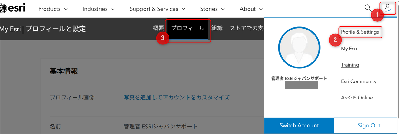 Esri アカウントに登録されたプロフィール情報を変更したいサポートESRIジャパン。