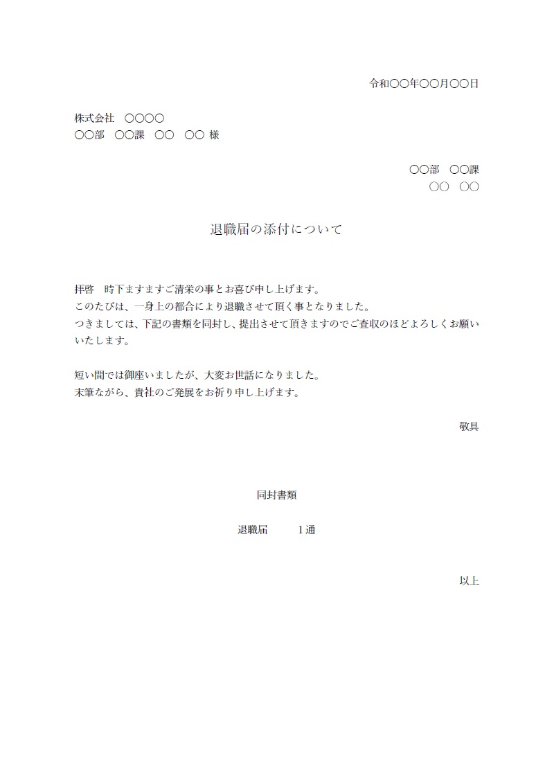 退職願の添え状テンプレート Excel・Word で例文・記入例を編集する事で簡易的に作成出来る素材となります。見本やサ。