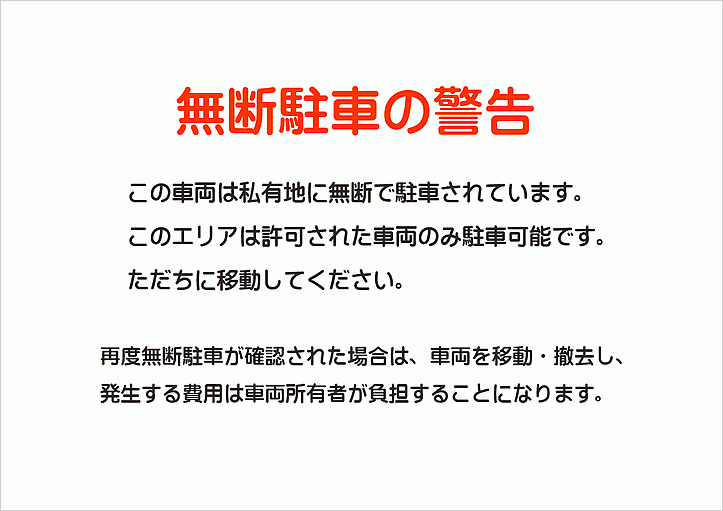 放置車両に貼る警告文の印刷用データ2種類を無料ダウンロード。