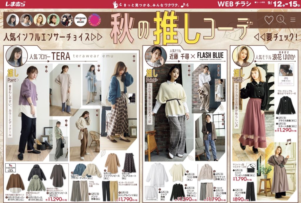 ファッションセンターしまむら on X: "📢チラシ更新 ー70年分の感謝を込めてー \🎊特別➆大記念企画🎊『TERA×yumi』や『田中里奈×星玲奈』などの インフルエンサーブランドコラボ💛 しまスタ10万人到達記念🎉 特別コーデも見逃せない🤩セール期間:5 20 土 ~5 23。